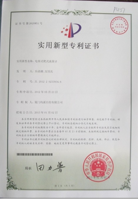 靶式流量計專利證書